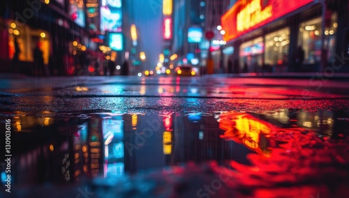 Rainy Night Cityscape: Neon Reflections in Puddle