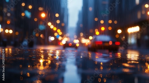 Rainy night in the city with glowing streetlights and blurred bokeh reflections on the streets, creating a moody, yet serene urban backdrop