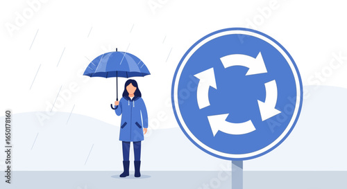 Rainy Weather Woman With Umbrella Standing Near Roundabout Sign Illustration