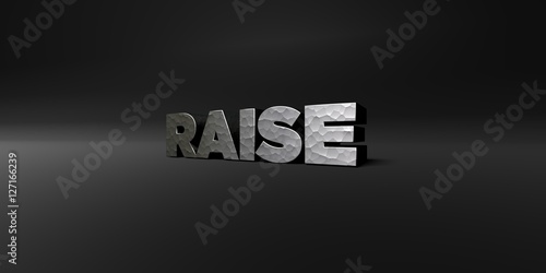 RAISE - hammered metal finish text on black studio - 3D rendered royalty free stock photo. This image can be used for an online website banner ad or a print postcard.