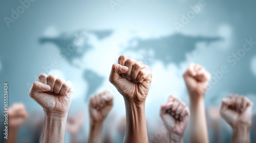 Raised fists in front of world map background symbolizing solidarity, workers’ rights and collective strength for Labor Day