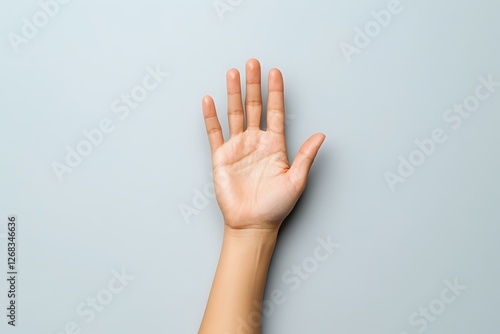 Raised open palm of a light-skinned person showing empty hand gesture against light gray background, representing greeting, voting, or volunteering concept.