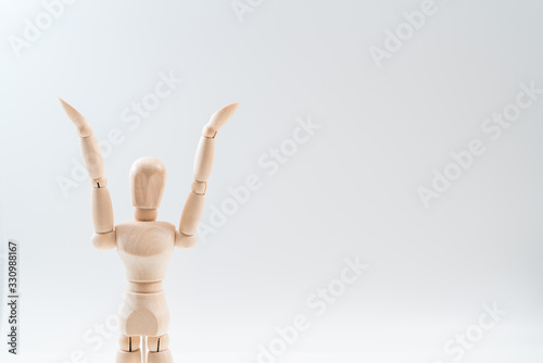 Raising Hands, Wooden dummy, Raising Hands on whiteBackground, copy space for your object or text