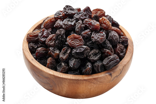Raisins in a wooden bowl isolated on transparent background