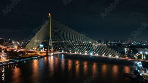 Rama 8 Bridge at night in Bangkok and Chopraya river, Thailand