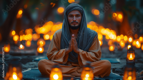 Ramadan evening portrait with muslim woman praying with traditional attire and lanterns illuminating the background