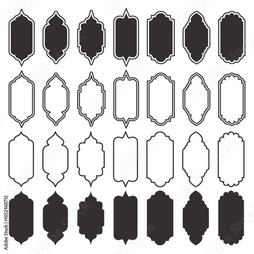 Ramadan frame shapes set. Indian window design. Turkish Islamic arch with ornament. Vector arabesque door icons. Muslim oriental architecture elements. Label sticker silhouettes. Traditional signs.