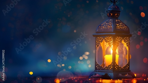 ramadan islamic greeting card of crescent moon decoration and lanterns with copy space area banner