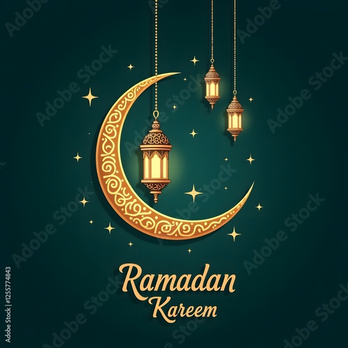 Ramadan Kareem greeting card, golden crescent moon with stars, ornate hanging lanterns, glowing light, deep teal background.