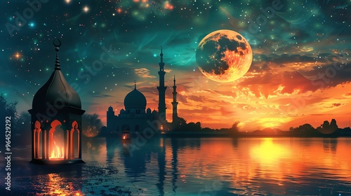 Ramadan kareem with serene mosque and crescent moment