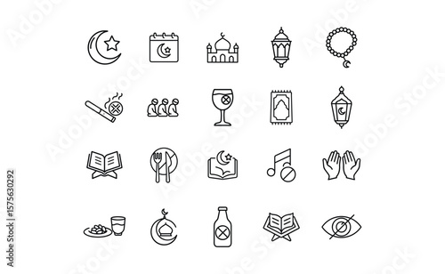 Ramadan Line Icons: Crescent Mosque Prayer Beads Lantern and Prohibitions.