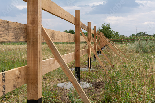 Ranch style fence. Rural wooden fence on green grass at farm ranch land in Shagany, Ukraina.