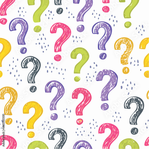 Random question marks seamless pattern background. Bright colored crayon drawn question marks.