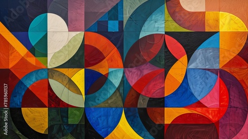 Random yet harmonious arrangement of geometric shapes, each layer adding depth in a spectrum of colors