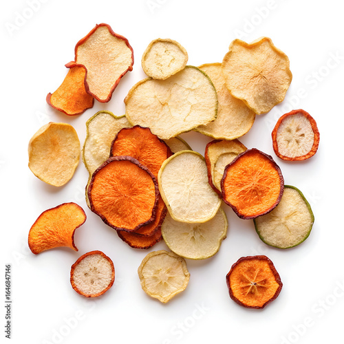Randomly scattered dried marrow squash chips isolated on a plain background, ideal for healthy snack