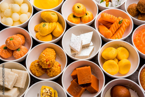 Rangoli of Assorted Indian sweets/mithai in bowl for Diwali or any other festivals, selective focus