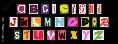 Ransom style alphabet collage, colorful cut-out letters on dark black background