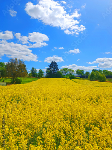 Rapeseed, canola or colza field in Stasin, Poland, rape seed is plant for green energy and oil industry, springtime golden flowering field