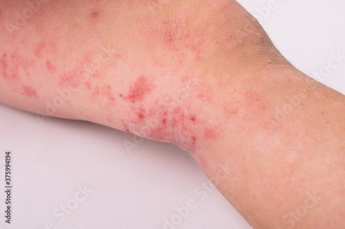 rash on a child leg isolated on white background, redness, allergic reaction, dermatitis symptom