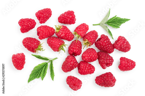 raspberries with leaves isolated on white background. Top view. Flat lay