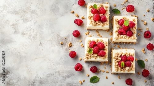 Raspberry cheesecake squares arranged on a gray background with granola crumbs and fresh raspberries copy space