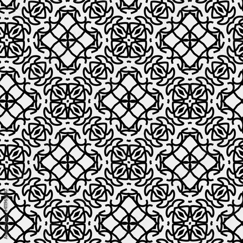 Raster geometric ornament. Black and white seamless pattern with star shapes, squares, diamonds, grid, floral silhouettes. Simple monochrome ornamental background. Repeat design for decor, print