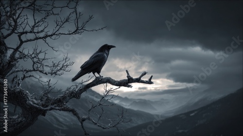 Raven perched on a bare tree branch against a moody twilight sky