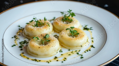 Ravioli plate displaying gourmet lobster-topped pasta circles arranged symmetrically on sophisticated white gold-rimmed dish, garnished with herb microgreens