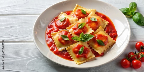 Ravioli with tomato sauce on a white plate, Italian cuisine, pasta, homemade, savory, delicious, comfort food, stuffed, cooked