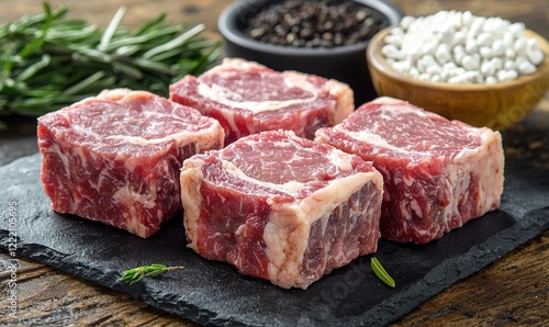 Raw beef cubes on slate with herbs and spices on wooden table, ready for cooking