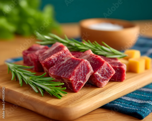 Raw beef cubes, rosemary, salt, and cheese on a wooden board. Generative AI