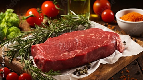 Raw Beef Steak Amidst Greens and Veggies. Generative AI