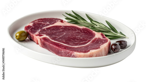 Raw Beef Steak Garnished with Fresh Rosemary Isolated on White Background in High Detail for Culinary Photography