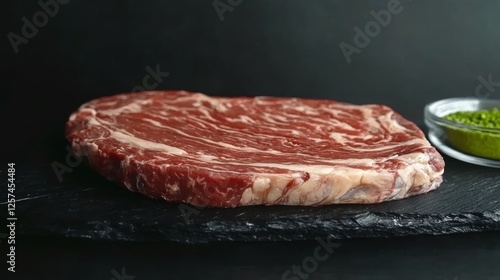Raw beef steak resting on a black stone plate against a black background for minimalist culinary presentation