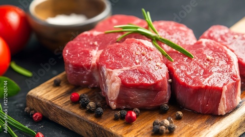 Raw beef steaks seasoned with pepper and rosemary on a wooden board ready for cooking : Generative AI