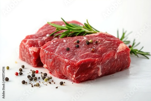 Raw Beef Still Life with Herbs and Pepper on White Background