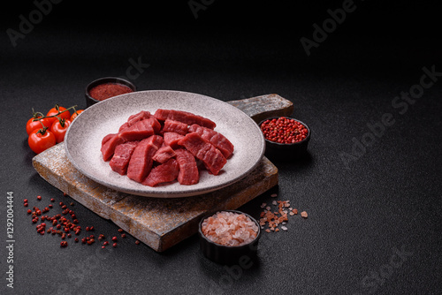 Raw beef tenderloin cut into slices with salt and spices