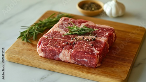 Raw beef with rosemary and spices on cutting board, raw, beef, meat, rosemary, spices, cutting board, fresh, ingredient