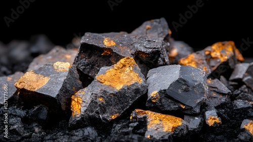 Raw black ore with gold inclusions closeup Rich mineral texture background