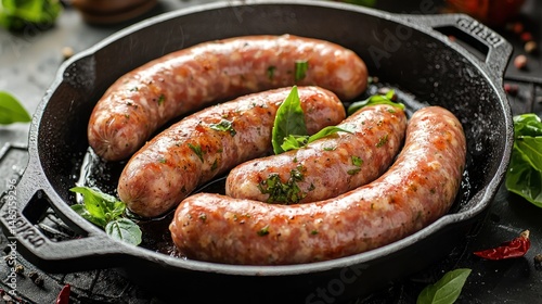 Raw bratwurst sausages in a cast iron pan