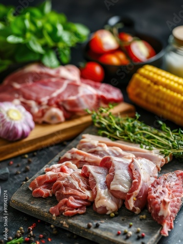 Raw chicken and pork with herbs, corn, and salad, close-up, high resolution