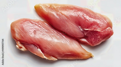 Raw chicken breast fillets are neatly arranged on a white background, highlighting fresh poultry meat for healthy cooking.