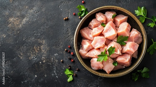 Raw diced chicken in a bowl preparing for Moroccan style curry with herbs on dark textured background and space for text