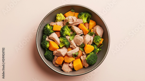 Raw dog food with chicken, broccoli, and pumpkin in a stainless steel bowl on a neutral background, natural pet diet concept.