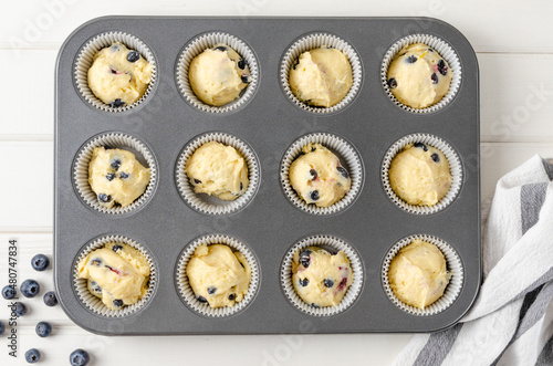 Raw dough for lemon muffins with blueberries and shtreisel in baking form on a white wooden background. Recipe step by step. Top view.