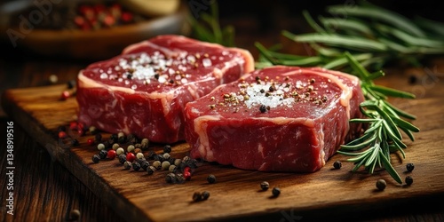Raw Filet Mignon Steak on Rustic Wooden Table with Coarse Sea Salt Black Pepper and Fresh Rosemary
