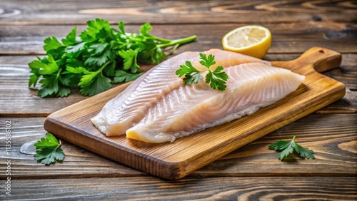 Raw fish fillet with parsley on a wooden cutting board, fish, fillet, raw, seafood, parsley, cutting board, wood, fresh