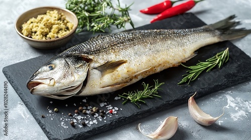 Raw fish sea bass on slate black board Ingredients for cooking grill roasting Top view Copy space : Generative AI