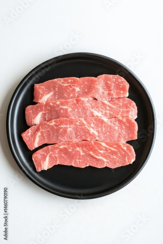Raw Flank Steak Strips on Black Plate Overhead Shot Ready for Cooking Preparation on White Background