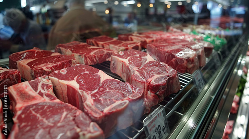 Raw fresh ribeye meat for sale in a shop's meat department.